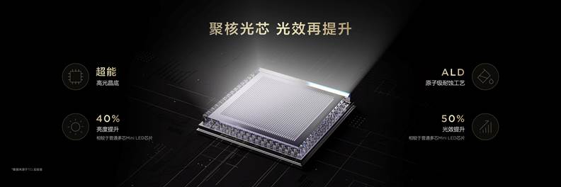 聚核光芯是Mini LED成像的源头,TCL使用超能高光晶底,以高端工艺实现电视亮度与光效的大幅提升,相较行业的多核Mini LED聚光芯片亮度提升40%,光效提升50%。在透镜环节,TCL Q10L 系列采用新一代超聚光微透镜来控制发光角度,相较行业的普通聚光透镜,实现59.4%的背光均匀性提升和41.2%的控光能力提升,实现精准控光。