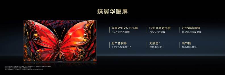 VA软屏具备5000:1的对比度,比对比度仅有1200:1的IPS屏幕更适合Mini LED;作为高端VA屏幕,华星HVA屏更是在7000:1超高原生对比度的基础上,增加了广色视角、广色域,升级为华星WHVA屏;再采用无黑边技术升级为华星WHVA Pro屏;在此基础上额外增加一层在行业里最高端的仅有0.5%反射率的低反膜,即为蝶翼华曜屏。无论白天黑夜,电视画面既不受外部强光干扰,也不受环境中倒影影响,画面纯净不泛白,观影清晰更沉浸。