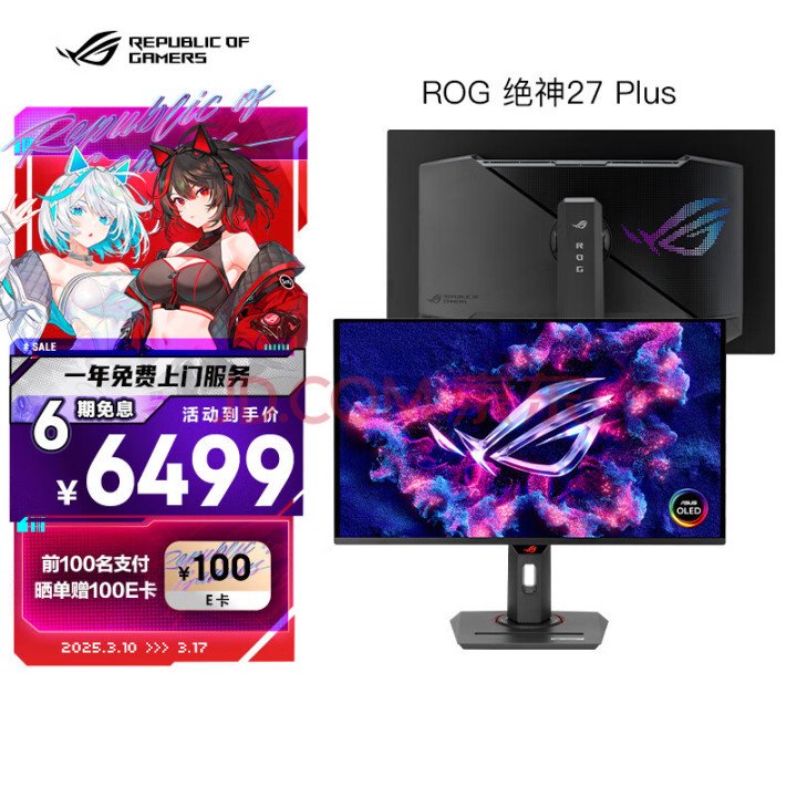 开京东APP搜索“ROG绝神27 Plus”即可抢购这款显示器,可享受6期分期免息、一年免费上门服务的福利,前100名下单并支付的消费者晒单还可获赠100元京东E卡。