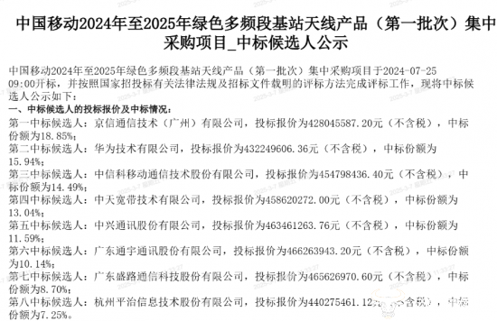 项目全称为“中国移动2024年至2025年绿色多频段基站天线产品(第二批次)集中采购项目”,不接受联合体投标,不接受代理商投标。1月20日发布了招标公告,3月6日发布了中标候选人名单,招标时间不算很长,过程较为顺利。