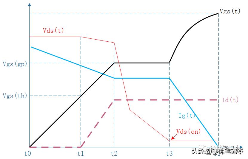 t0→t1:当GS两端电压达到门限电压Vgs(th)的时候(可以理解为对Cgs进行充电),MOS管开始导通,这之前MOS管处于截止区;