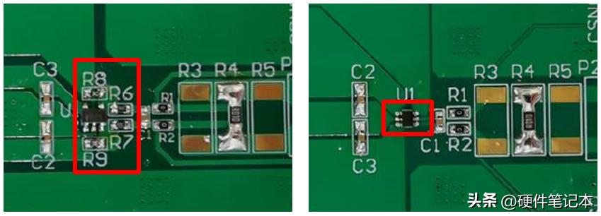下图是使用SOT23-5小封装运放和4个0603封装的电阻实现的分立方案PCB,而集成方案面积只有分立方案的10%,并且布线更加便捷。
