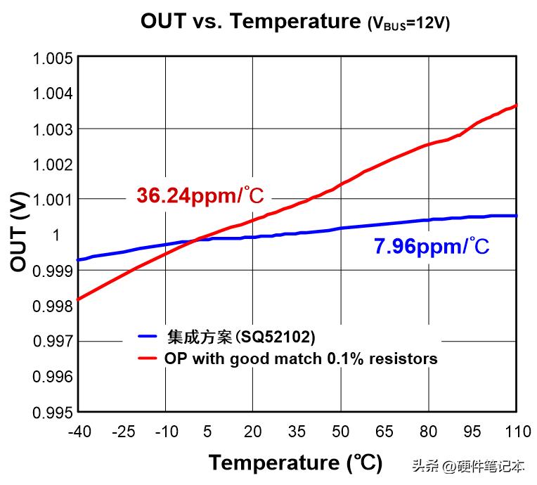 从下图可以看到,分立方案的整体温漂为36.24ppm/℃,在全温度范围内误差的变动将近0.6%。与之相对应的,高性能的集成电流检测放大器往往能实现更小的温漂。