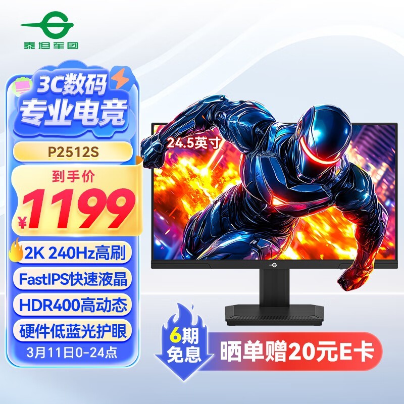 泰坦军团P2512S显示器24英寸2K240Hz京东活动价1022元