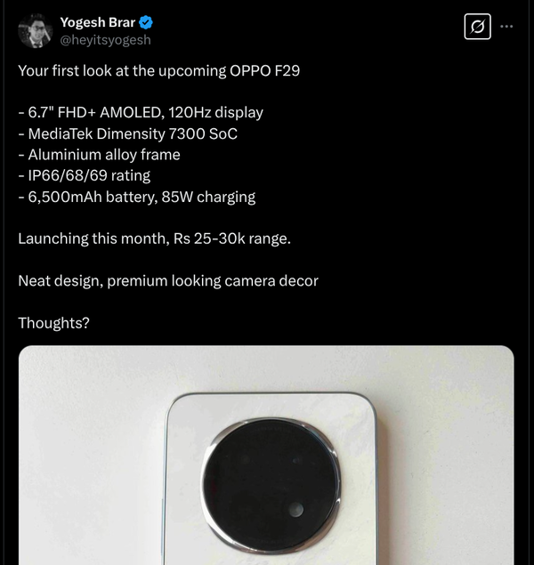 【CNMO科技消息】近日,有海外博主在社交平台X上曝光了OPPO F29的首张真机图,并透露了该机的部分核心配置、发布时间以及预计售价。