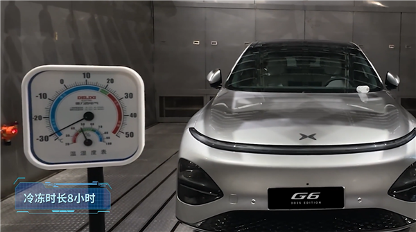 不止如此,装载了这块电池包的G6随后又被送到-30℃的冷库中模拟极地环境,冰冻时长达8小时,随后直接进行补能测试。