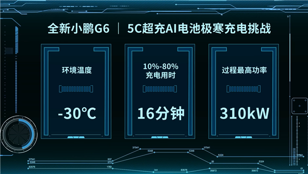 实测在极寒环境中,这块电池从10%充至80%仅用时16分钟,最高充电功率310千瓦,要知道极寒是非常不适合电池补能的环境,然而小鹏5C超充AI电池还是发挥了超长规的水平。