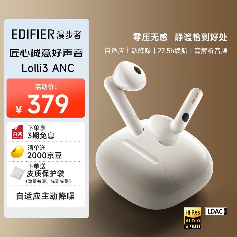漫步者Lolli3 ANC半入耳主动降噪蓝牙耳机仅284元