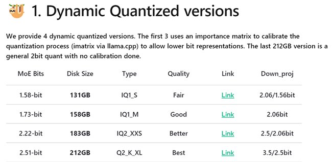 动态量化是指对模型的关键层实施4到6bit的高精度量化,同时对那些非关键的混合专家层(MoE)采用更为激进的1到2bit量化方法。通过这种针对性的量化手段,DeepSeek R1模型能够被压缩至最少131GB(1.58-bit量化),在保证参数量的前提下,大幅度降低了本地部署的门槛。