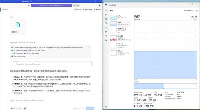 而如果有长文本对话需求的用户,则可以使用非满血的70B蒸馏模型。在最大131072上下文长度条件下,云彣(UniWhen)「珑」系列DDR5 192GB套条依然能够完整加载模型,并高效完成运算百万字数级别小说所需的数据处理任务。其内存使用降至90GB,占用率则为47%。冗余非常充足。