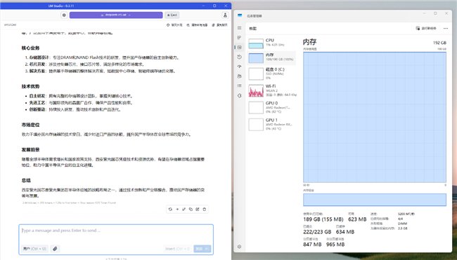 在上下文长度设定为20000,且仅使用CPU运算条件下进行测试。DeepSeek R11.58-bit量化模型经云彣(UniWhen)「珑」系列DDR5 192GB套条加持,运算速度达到2.44 tok/sec,内存使用达到189GB,占用率则为100%。其表现足以证明在日常任务中,可以获得较为流畅的问答体验。