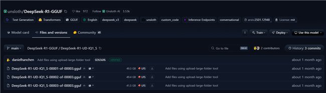 下载模型:从Hugging Face网站下载unsloth DeepSeek-R1 GGUF 1.58-bit量化模型。