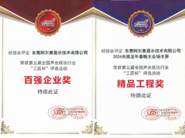 3月8日,在第五届全国声光视讯“工匠杯”评选活动 中,AET阿尔泰凭借卓越的技术实力荣获“百强企业奖” 。 同时,由AET阿尔泰提供的2024央视龙年春晚主会场主屏 也斩获了“ 精品工程奖” 称号,彰显了品牌在LED显示行业的领先地位与卓越影响力。