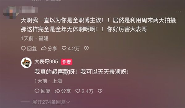 有网友在视频下方评论道:“大表哥发现被亲友背刺的时候,一定很痛苦”,对此大表哥回复称:“沒事,不痛苦,我沒有去查是谁,我不想面对,我走一切都解決了。”