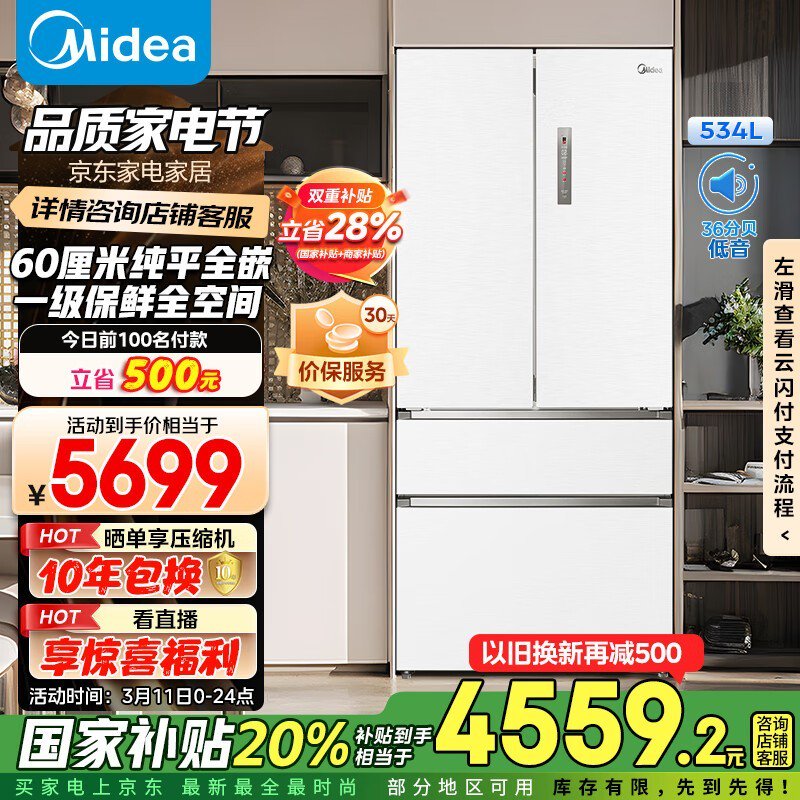 美的534L法式多门冰箱MR-560WUFPZE大容量节能静音促销