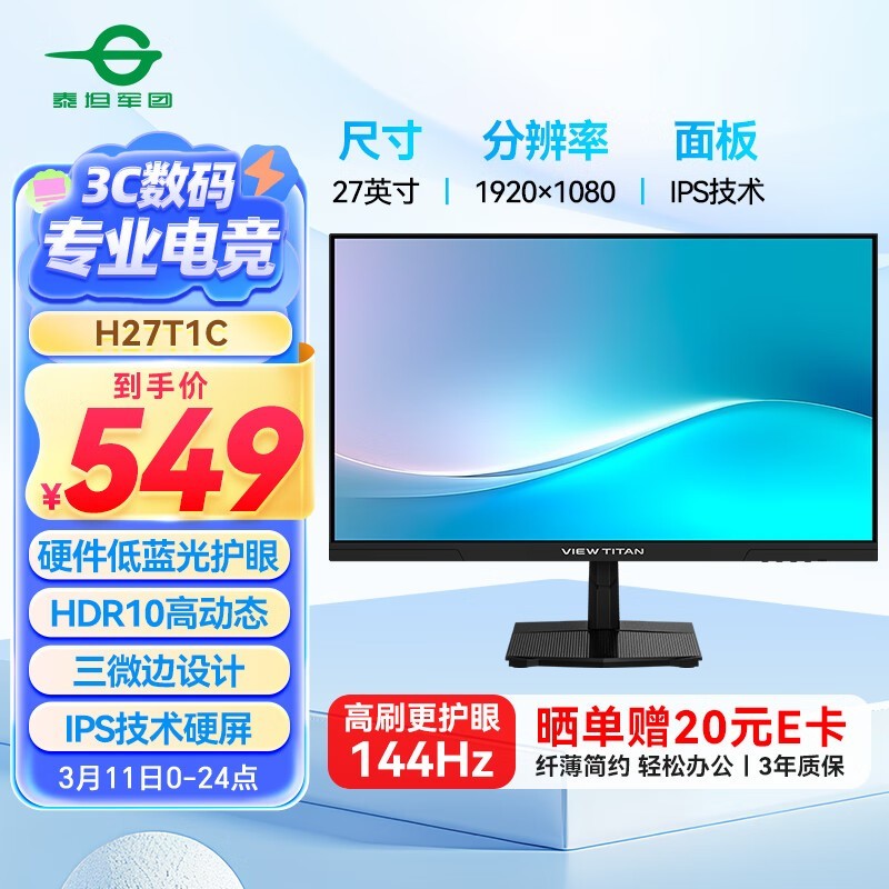 泰坦军团H27T1C显示器京东优惠低至444元