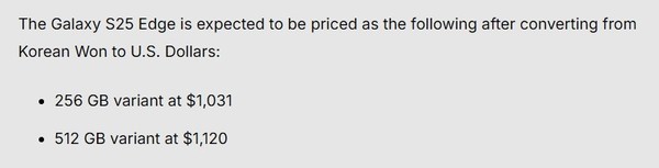 据外媒透露,三星S25 Edge 256GB和512GB版本售价分别为1031美元和1120美元(折合人民币约为7500元和8100元),成为S25系列中仅次于Ultra机型的第二高价产品。不过,该机可能不会有1TB版本提供,这也从侧面说明其定位并非顶级。