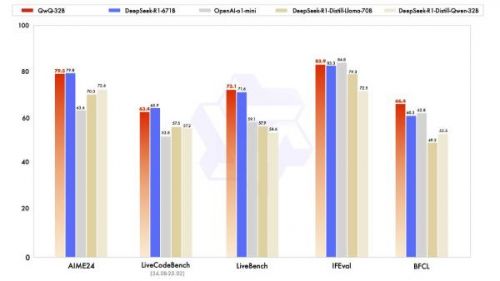 在产、学、研等领域纷纷得到青睐的背后,尽管参数量仅为32B,但阿里QwQ-32B通过大规模强化学习训练,在数学、代码及通用能力等多个关键领域实现质的飞跃,展现出与拥有671B参数的DeepSeek-R1相媲美的性能。