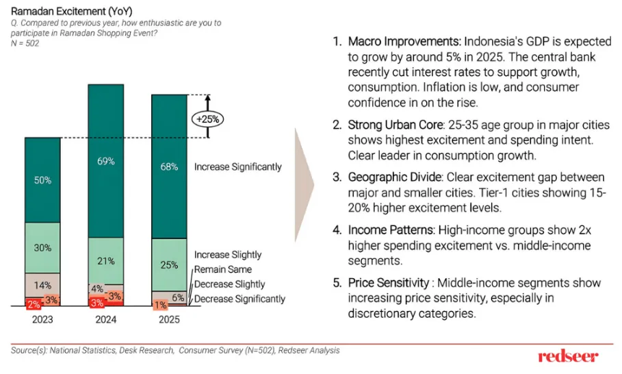 斋月依然是印尼消费者的购物狂欢期,约 93% 的消费者对2025年的斋月感到兴奋。年轻城市人口的兴奋程度最高——他们将成为本节日主要的消费者群体。与此同时,根据Redseer的研究结果发现,礼品和健康与保健类别有望成为2025年的斋月消费“黑马”。因此,品牌应专注于捆绑销售和开展与礼品相关的营销活动,以充分利用这一机会。而健康与保健品牌也需要创建部分教育内容,补充剂和运动休闲品牌将从该节日受益最多。
