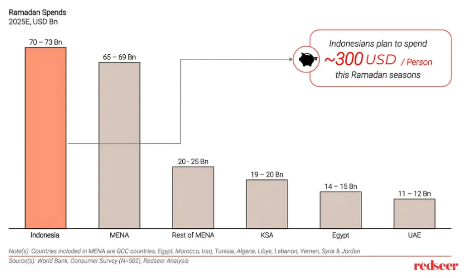 印度尼西亚是世界上最大的穆斯林人口国之一,每年斋月期间,零售额都会激增。根据数据调研机构Redseer预估,2025年,印尼市场在斋月期间的消费规模将达到700亿-730亿美元,约为人均300美元,这也凸显了印尼消费者在节日期间强大的消费能力。