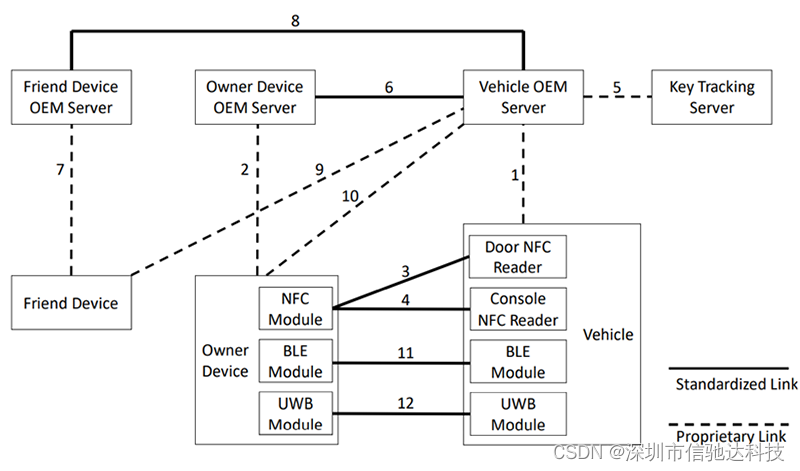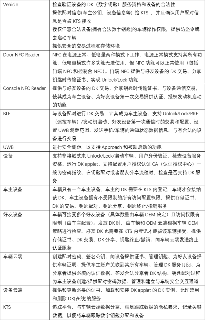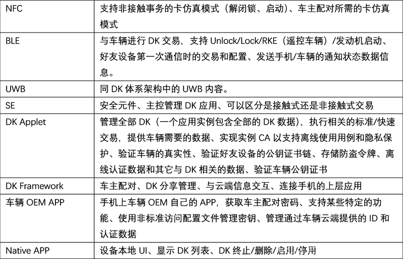 3. 所有合格的设备都有一个经过认证的SE以及NFC功能,使设备与车辆能够进行通讯,其中NFC功能是必须的,保证手机在没电的情况下依旧可以靠NFC对车辆的一些操作;