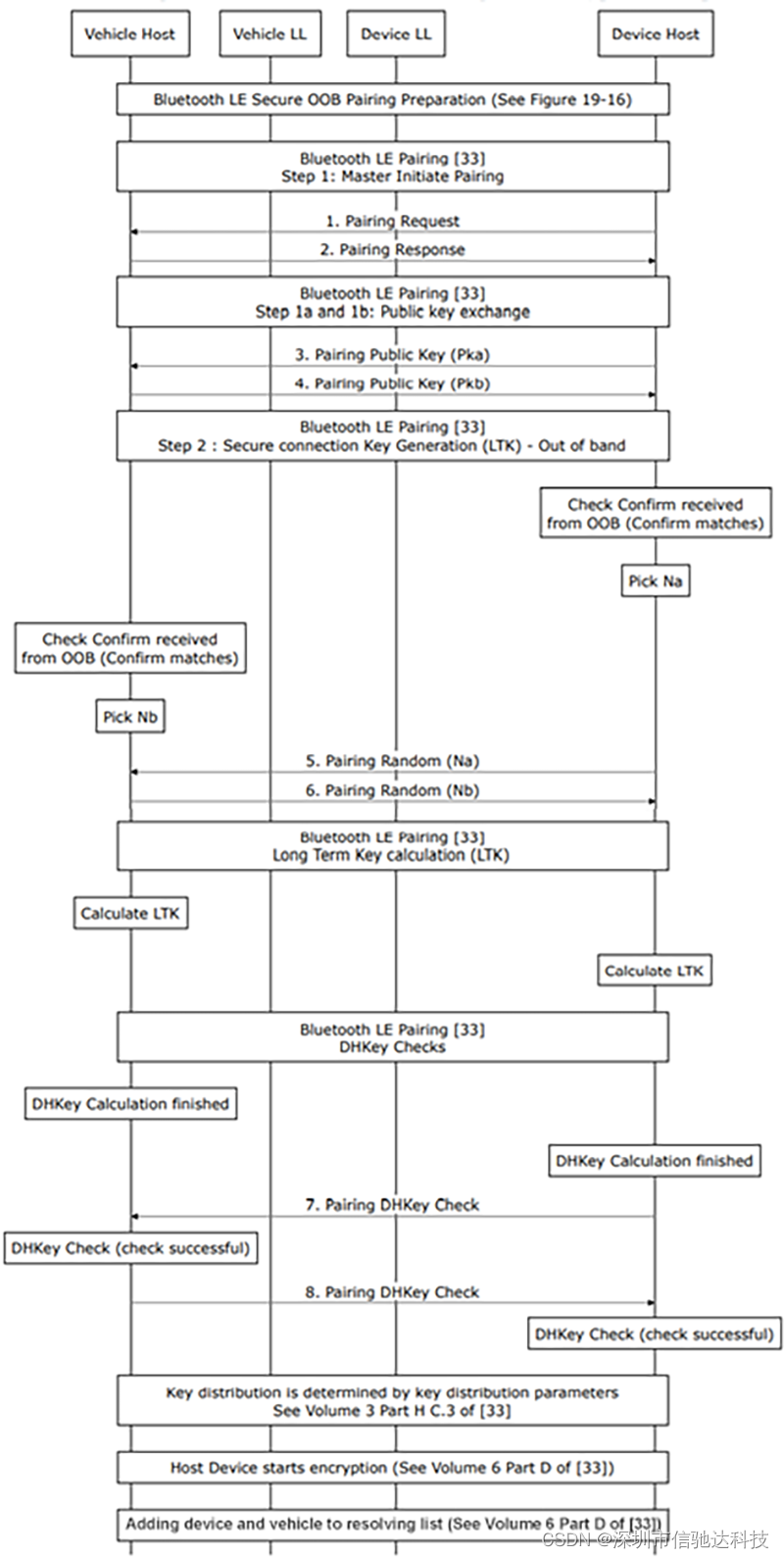 3. 生成LTK(长期的连接安全密钥):设备和车辆都要验证作为OOB配对准备程序的一部分接收到的确认值是否匹配。设备和车辆生成1个随机数(Na和Nb)。设备发送(Na)给车辆,车辆发送(Nb)给设备;