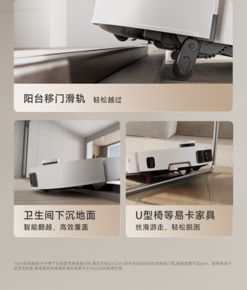 在日常家庭清洁中,总会有一些小门槛、地轨等扫地机器人无法跨越的障碍,造成阳台洗手间等区域无法自动清洁。而本次搭载仿生机械足的追觅S50 Pro,在遇到以上障碍时,双关节支撑系统可以像人的大腿和小腿一样自动支起收回,至高可跨越6cm台阶。家中常见的阳台厨房移门滑轨、卫生间门槛、复杂U型椅等情况都可以轻松跨越脱困,自在穿行家中任何一角,不放过一处尘埃。