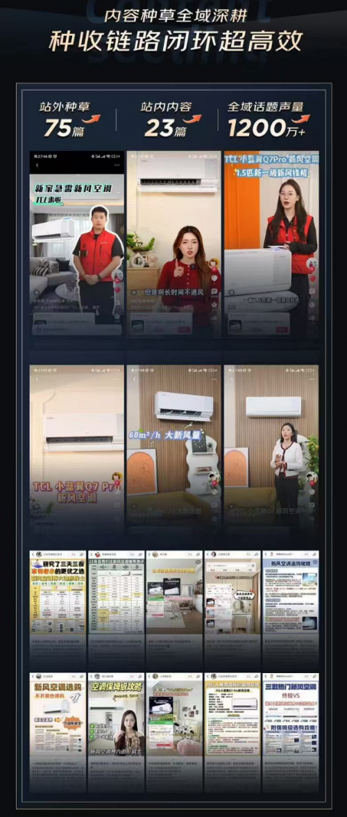 在站外,品牌通过各大媒介平台的种草传播为新品的开售扩大声量。TCL小蓝翼Q7 Pro新风空调在网易云、百度、芒果TV等多个APP开屏以及线下商城大屏投放了广告,实现强势曝光。而在内容营销方面,由小红书平台KOC结合新品亮点进行传播,通过口碑种草助力消费者决策,为正式开售提前发酵蓄水,并将需求人群最终引流至京东。
