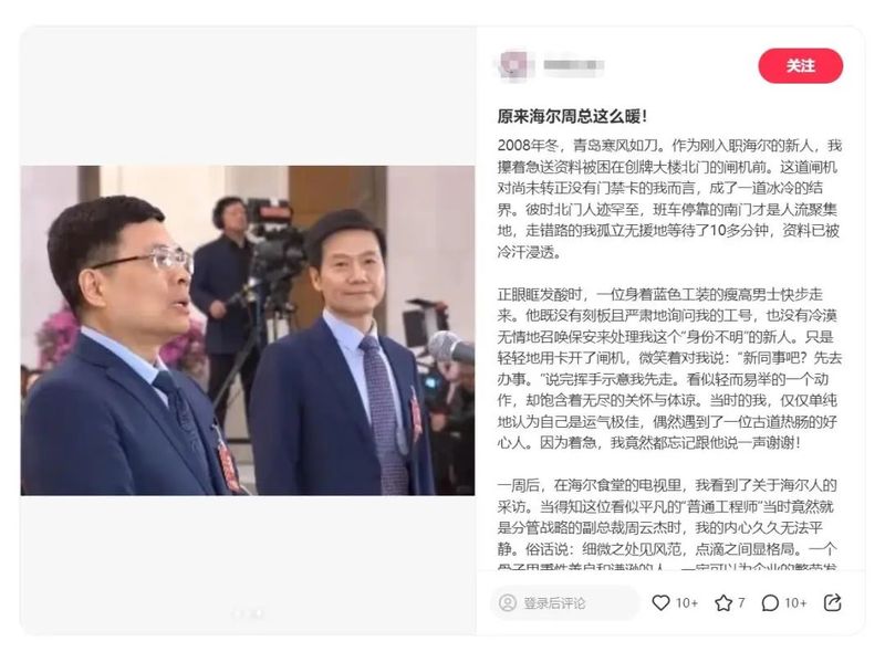 一名已经离职的海尔员工也在小红书上记录了一段关于周云杰的过往片段:2008年冬天,她因为刚入职还没有门禁卡,被卡在了海尔创牌大楼的门外,寒风中等待十几分钟后,被一位身着蓝色工衣的男士看到,随后快步走过来刷开闸机,微笑着说“新同事吧?先去办事。”