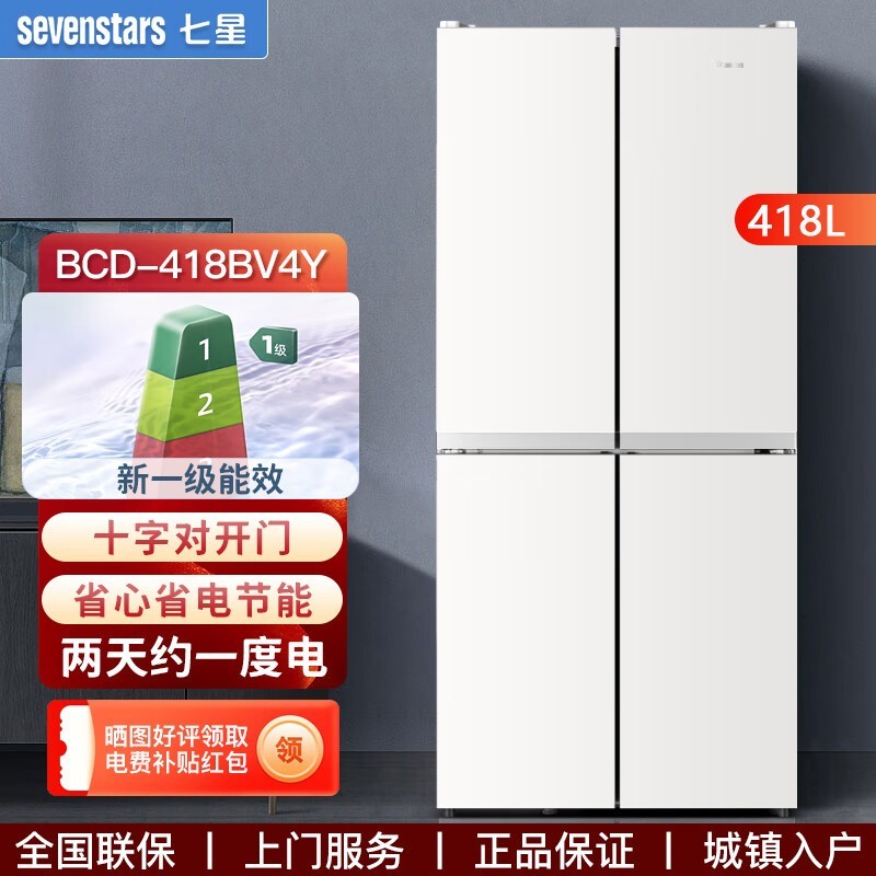 七星超薄四门冰箱:节能保鲜,418L大空间,1级能效,静音时尚厨房新体验(1569元)