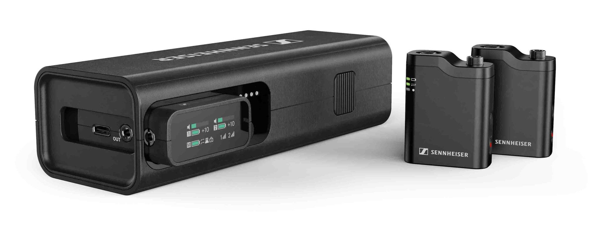 您会看到一个坚固可靠、多功能的充电模块。这个充电模块是Profile Wireless的核心组件。它可以收纳系统的重要组件并为其充电,还可以兼作手持式或桌面麦克风。这个充电模块能够稳妥地收纳一个配有OLED触控显示屏的双通道迷你接收机,两个已预先配对、可自动连接到接收机的夹式麦克风,将麦克风固定在衣服上的磁力夹,以及将接收机连接到手机或摄像机冷靴座的转接头。拉链包中还包括一根供摄像机使用的3.5毫米插孔盘绕电缆,一根USB-C转USB-C充电线和用于夹式麦克风和充电模块的防风罩。