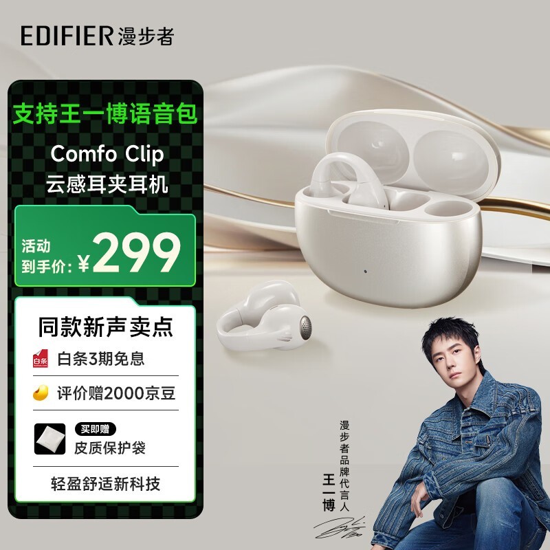 漫步者ComfoClip蓝牙耳机珠光白,到手仅299元