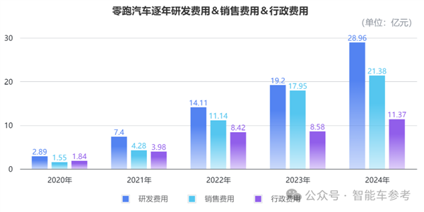 而支出方面,零跑的投入也在加码,2024年的研发费用、销售费用、行政费用分别为28.96亿元、21.38亿元和11.37亿元,同比增速分别为50.87%、19.11%、32.60%。