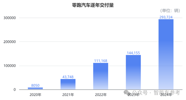 2024年全年,零跑汽车总交付量为293,724辆,同比大涨103.8%,全年销量杀入新势力前三,是2024年名副其实的新势力黑马。