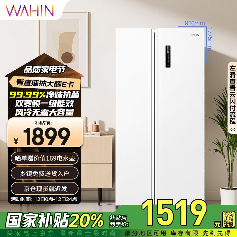 华凌610L风冷对开门冰箱极地白一级能效京东到手1505元