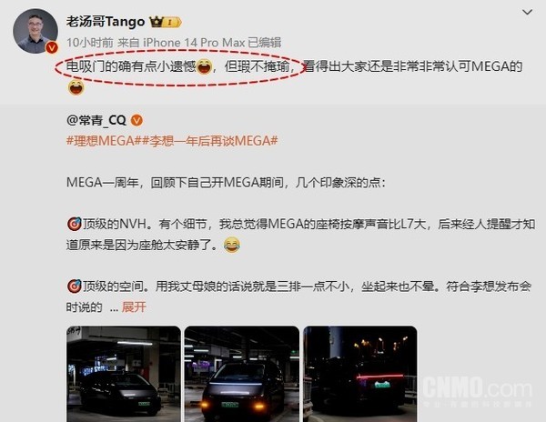 【CNMO科技消息】近日,有博主谈到理想MEGA的用车感受,其认为该车的NVH、空间、5C超充、舒适性、行车视野等都是优点,但也有两个“不爽”的点:没有电吸、踏板的高度变扭。对此,理想汽车第一产品线总裁汤靖转发微博称,理想MEGA前排无电吸门的确有点小遗憾,但瑕不掩瑜。