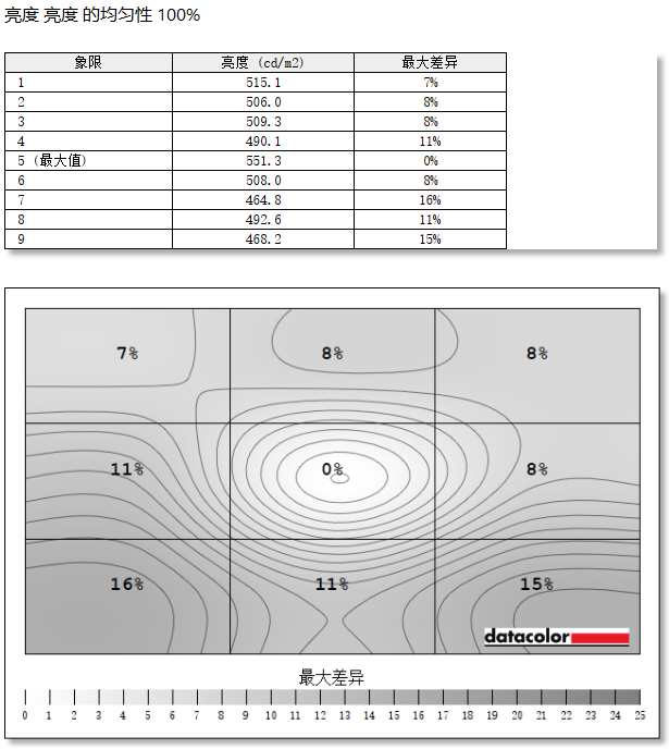 亮度均匀性的测试中,优派VX27G58-2K显示器整体表现也很优秀,亮度最大为第5象限,最大差异在第7象限,差值为86.5cd/m²。