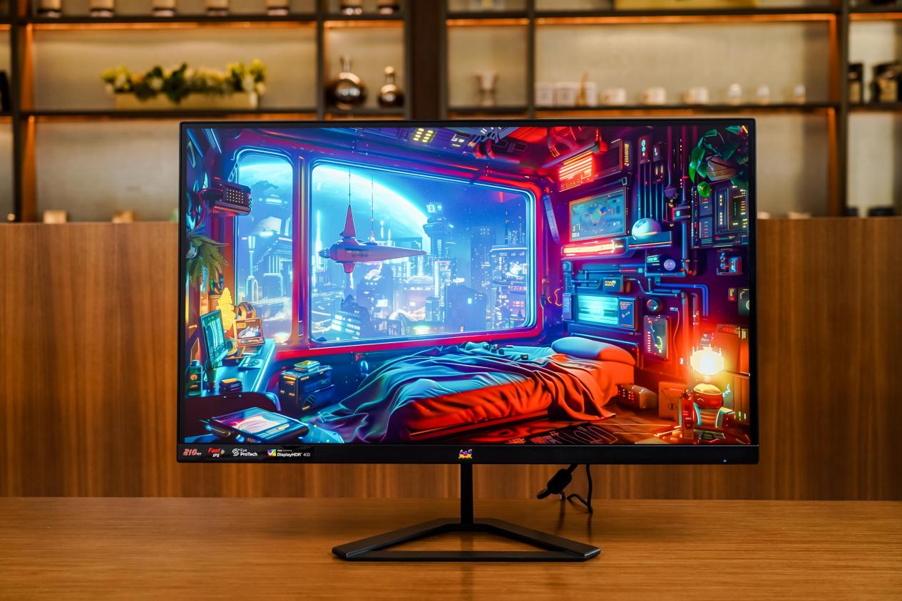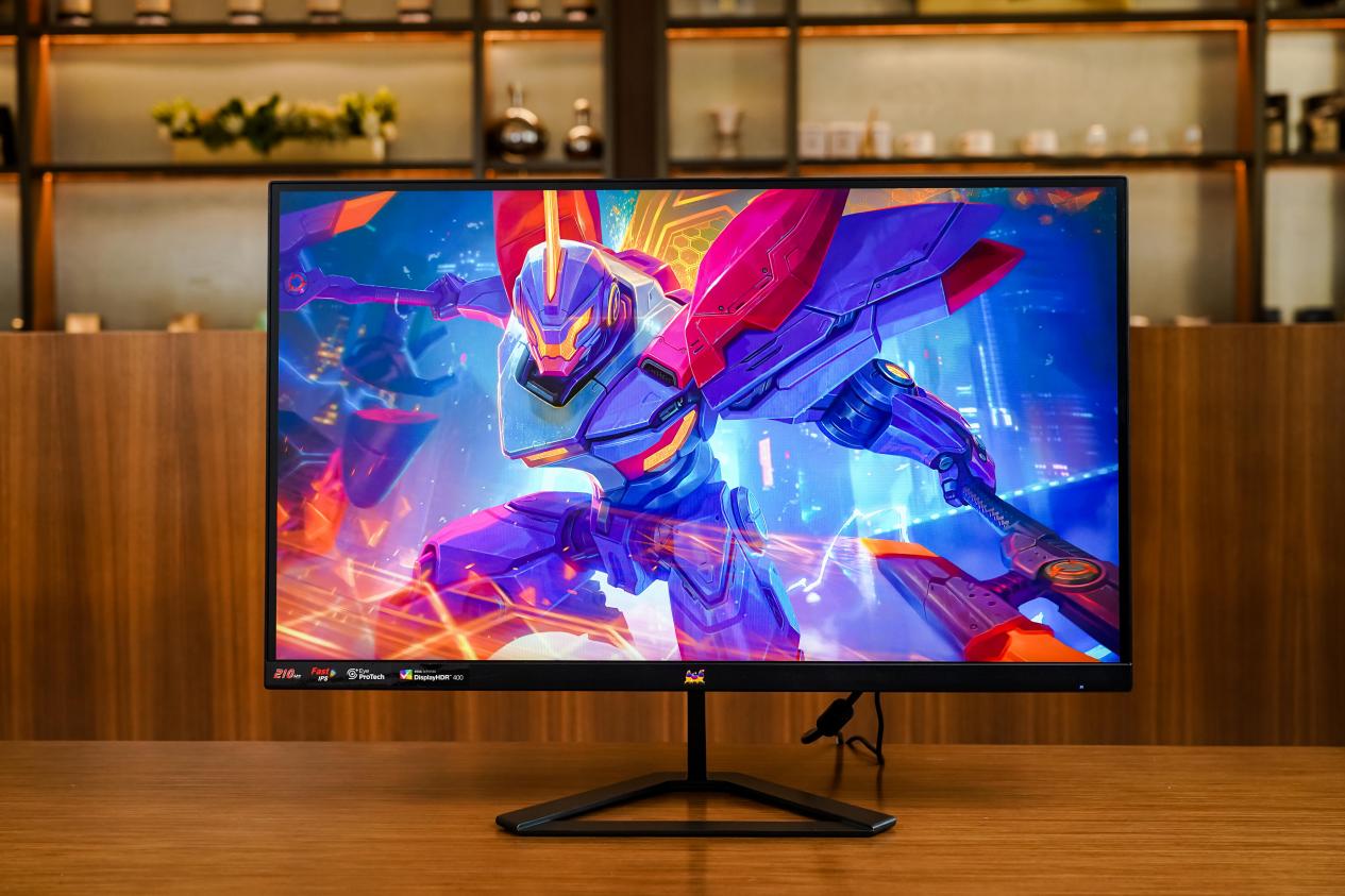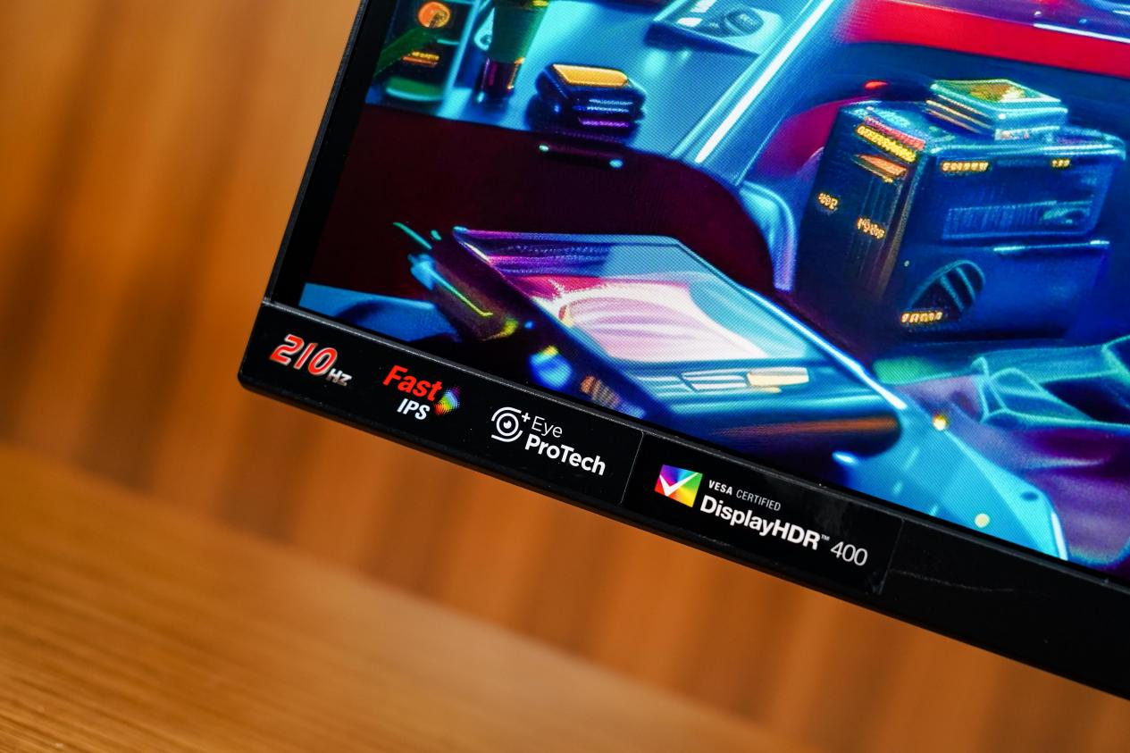 把视角往下移,可以看到优派VX27G58-2K左下角有产品参数,包括210Hz、FastIPS、EyeProTech以及HDR400认证