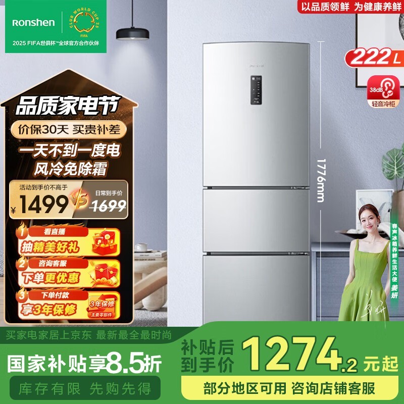 容声222升三开门冰箱,风冷无霜技术,仅1099元