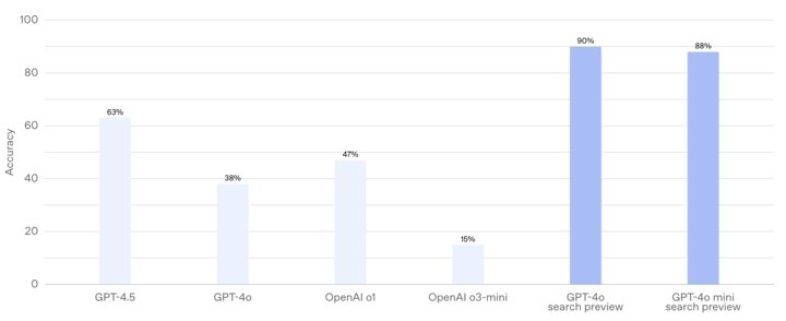 在内置工具方面,Web 搜索工具支持 GPT-4o 和 GPT-4o-mini 模型获取网络最新信息并提供清晰的引用。在 SimpleQA 基准测试中,这两款模型的搜索预览版分别拿下了 90% 和 88% 的亮眼准确率。
