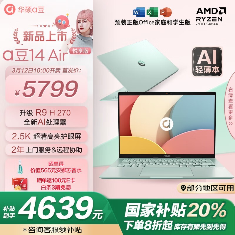 华硕a豆14 Air悦享版轻薄本优惠价4639元