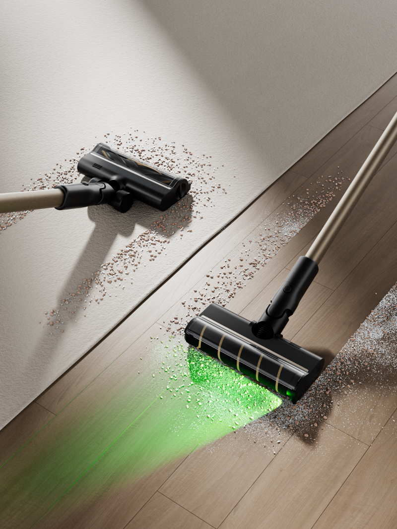 首先,清洁性能是核心需求,而吸力大小、刷头设计是判断清洁性能的关键。一般来说,吸力越大,清洁效果越好,普通家庭选择150AW以上即可应对日常需求,如果养宠物或者家里铺了地毯,则建议选更大吸力的型号,并且产品应配备适应地毯清洁的刷头。刷头设计会直接影响清洁范围的覆盖效率,尽量选择带广角绿光显尘技术的滚刷,将清洁过程可视化,如果同时搭配有除螨刷头、除尘软毛刷等配件更好,可以满足日常不同场景的需求。