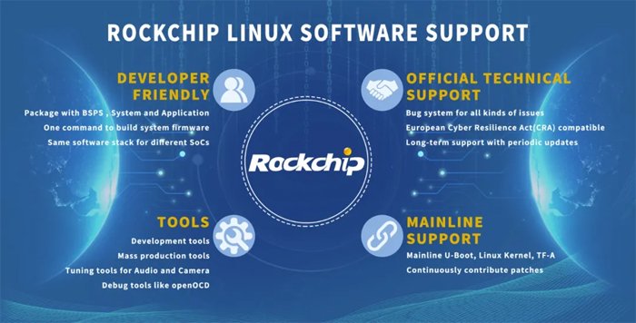 针对工业场景智能化,瑞芯微提供全面软件保障支持,主流芯片平台持续更新适配最新Linux及Android系统版本,为全球开发者提供 BSP、系统与应用一体化软件包,各领域合作伙伴及开发者均可在瑞芯微官方平台获得全类型问题的技术支持以及各类开发调试工具。在安全支持方面,瑞芯微提供全链路的安全启动SecureBoot、Trustzone、加解密引擎等全面的安全保障机制,防止固件完整性被篡改。
