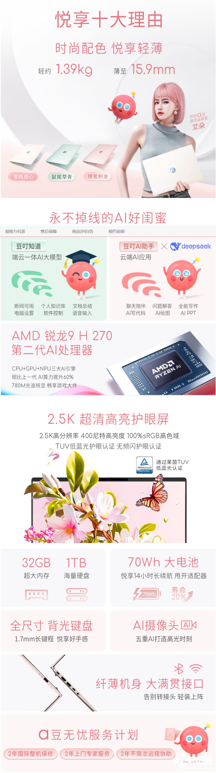 华硕今年进一步扩展了其a豆产品线,带来了多个系列的新品。目前全新的a豆14 Air悦享版已经在国内平台上架并且正式开售了,搭载了AMD锐龙9 H 270处理器,提供了三种配色可以选择,售价5299元,厂家提供两年整机国际联保服务。另外晒单得价值565元安娜苏香水,返100元京东E卡,支持白条3期免息分期。此外,该系列笔记本首发即支持国补,国补到手价4239元起。