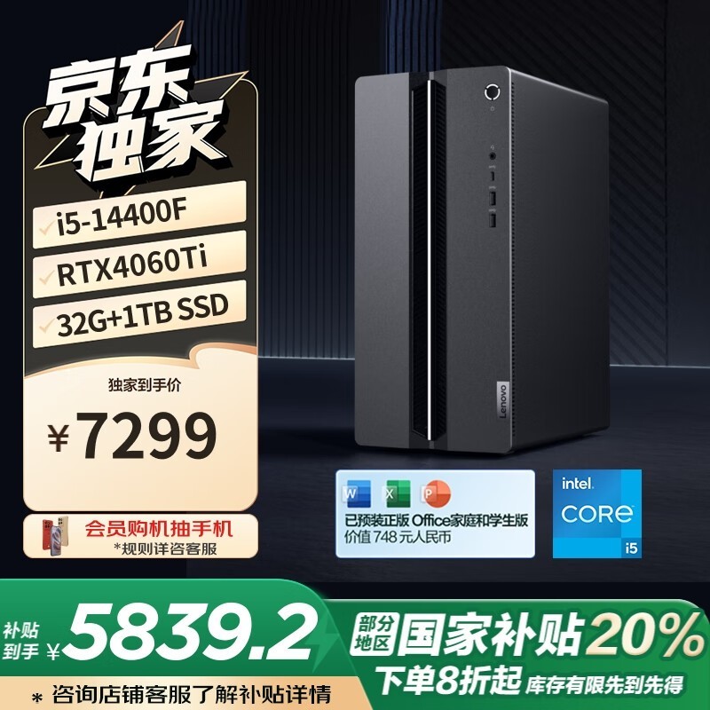 联想GeekPro游戏台式机Intel i5-14400F/32GB/1TB/RTX 4060Ti 8G