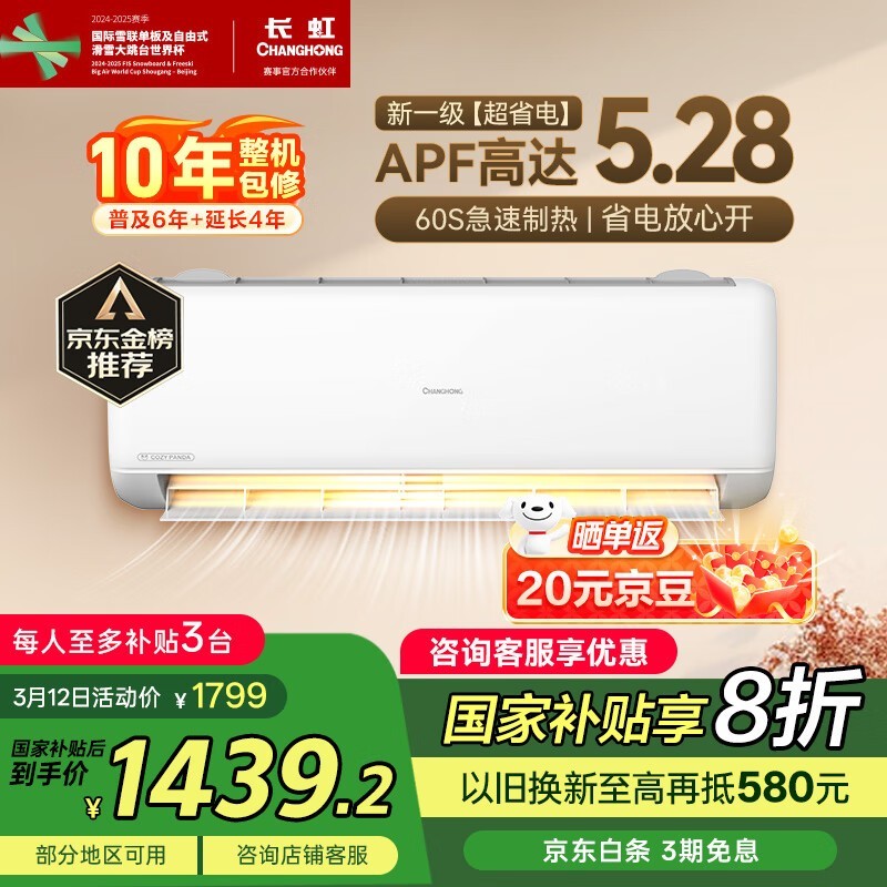 长虹熊猫懒1匹空调,活动价低至1309元