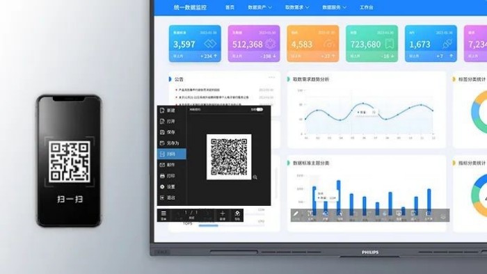 传统会议中,从议程安排到汇报文档,参会者往往需要打印大量会议资料。飞利浦商显IWB支持电脑、手机、Pad等多端无线投屏,至高9分屏呈现多个方案,资料一键投屏,无需打印分发;针对会议中研讨的内容、决策、方案等会议纪要,也无需会后整理、打印,转发邮箱或一键扫码即可带走;同时支持多点触控,便于多人同屏书写、探讨记录、头脑风暴,提升团队协作体验;还可屏幕共享、白板互动、远程会议等,使得异地沟通也能顺畅无阻。