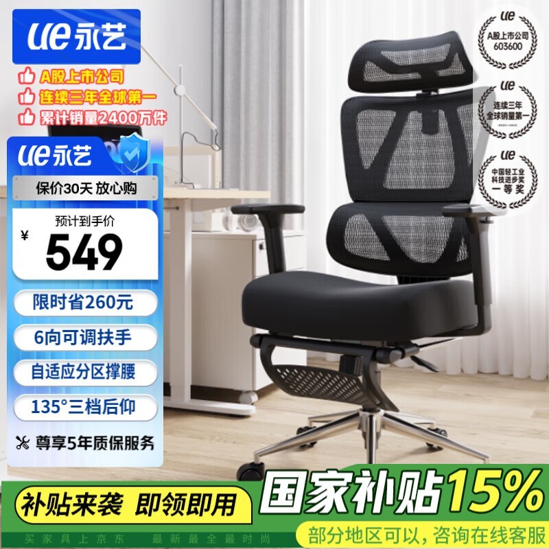 永艺MC-1151E人体工学电脑椅黑色带搁脚款舒适座椅