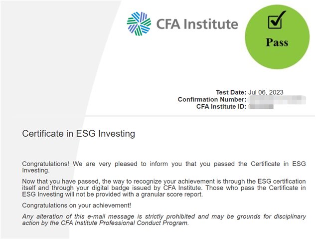 颁证机构:CFA-ESG证书由在全球投资业享有较高声誉的CFA协会(CFA Institute)颁发,CFA-ESG证书在全球范围内具备广泛的认可度和权威性。