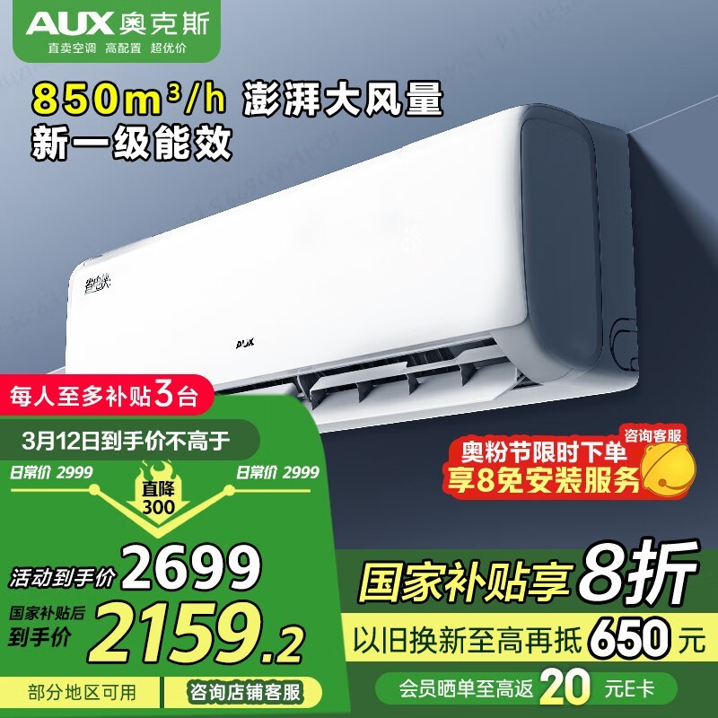 奥克斯2匹省电侠1级能效空调挂机仅1970元